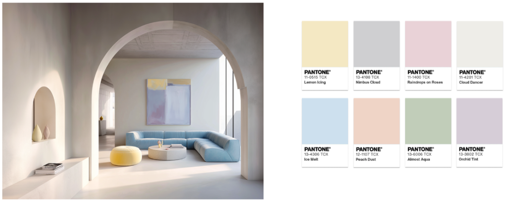 Los tonos pastel y neutros combinan perfectamente con Cloud Dancer, ofreciendo sutiles cambios de tonalidad matizados, agradables y discretos. Esta paleta irradia suavidad y ligereza.