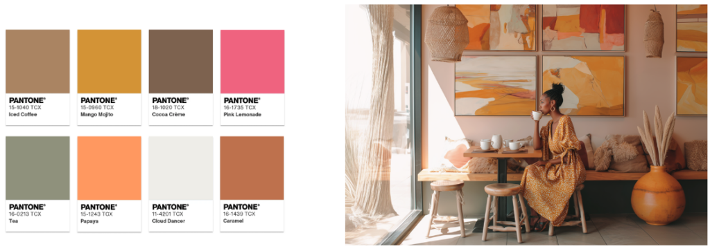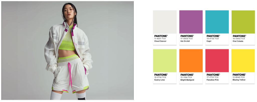 Esta paleta es perfecta para líneas de moda juvenil o líneas de temporada que buscan alegría y optimismo. Se puede utilizar Cloud Dancer en etiquetas colgantes de papel texturizado, con el logo o un detalle impreso en un color de acento fuerte (como el «limonada rosa») para evocar la efervescencia.