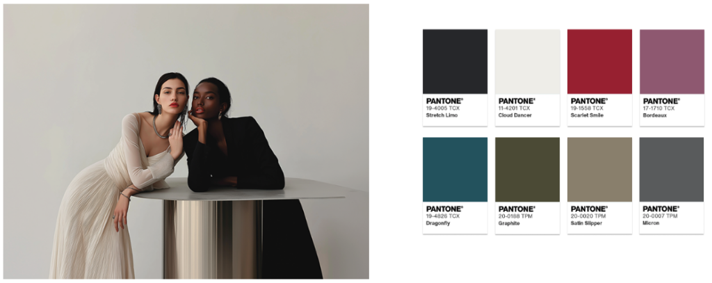 En esta paleta, el yin del blanco inevitablemente se encuentra con el yang del negro, acentuado por un seductor rojo labial. El glamour se intensifica con tonos amarillos, verdes y lilas vibrantes. Cloud Dancer actúa como el punto de luz que realza el brillo.